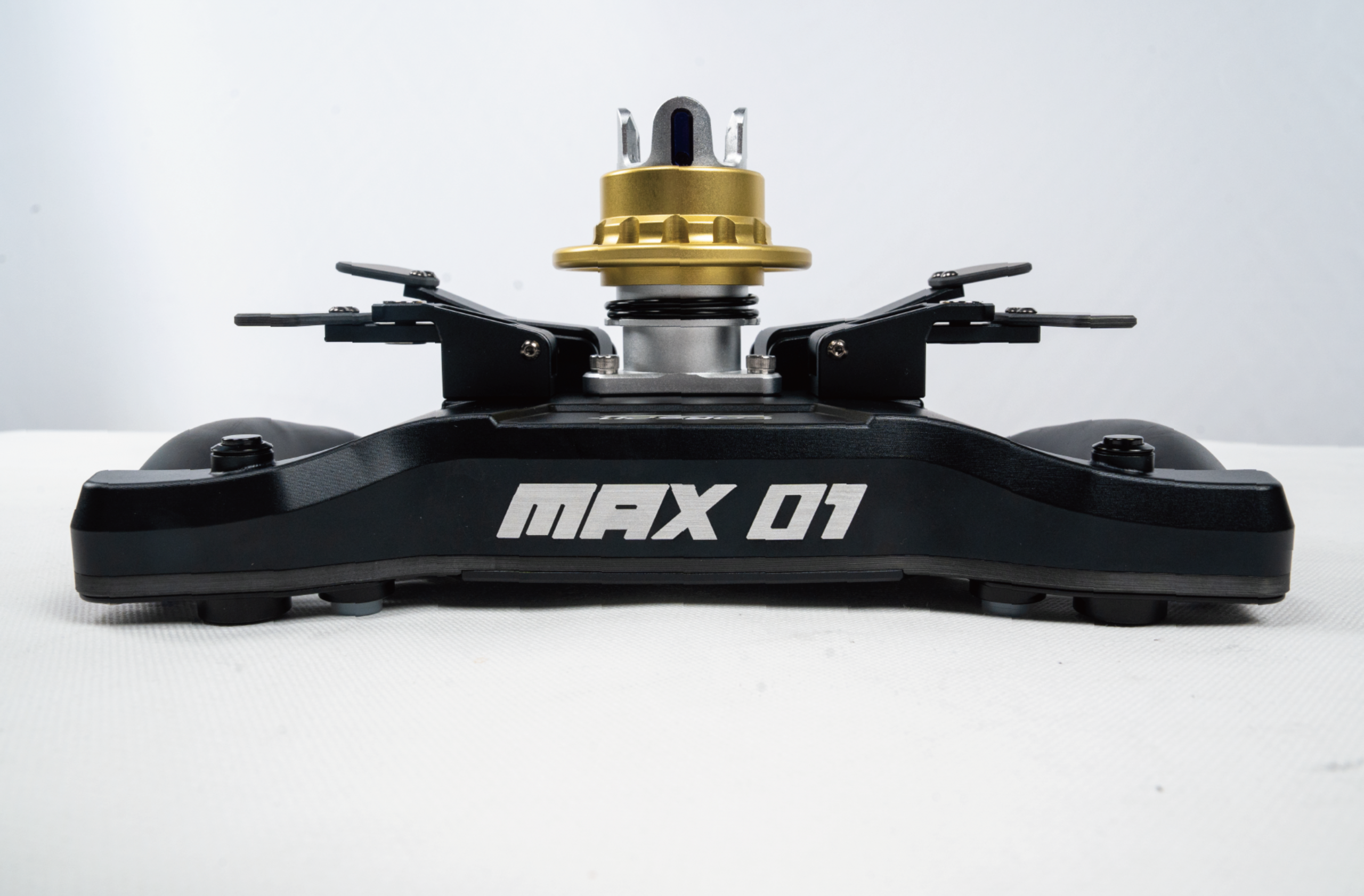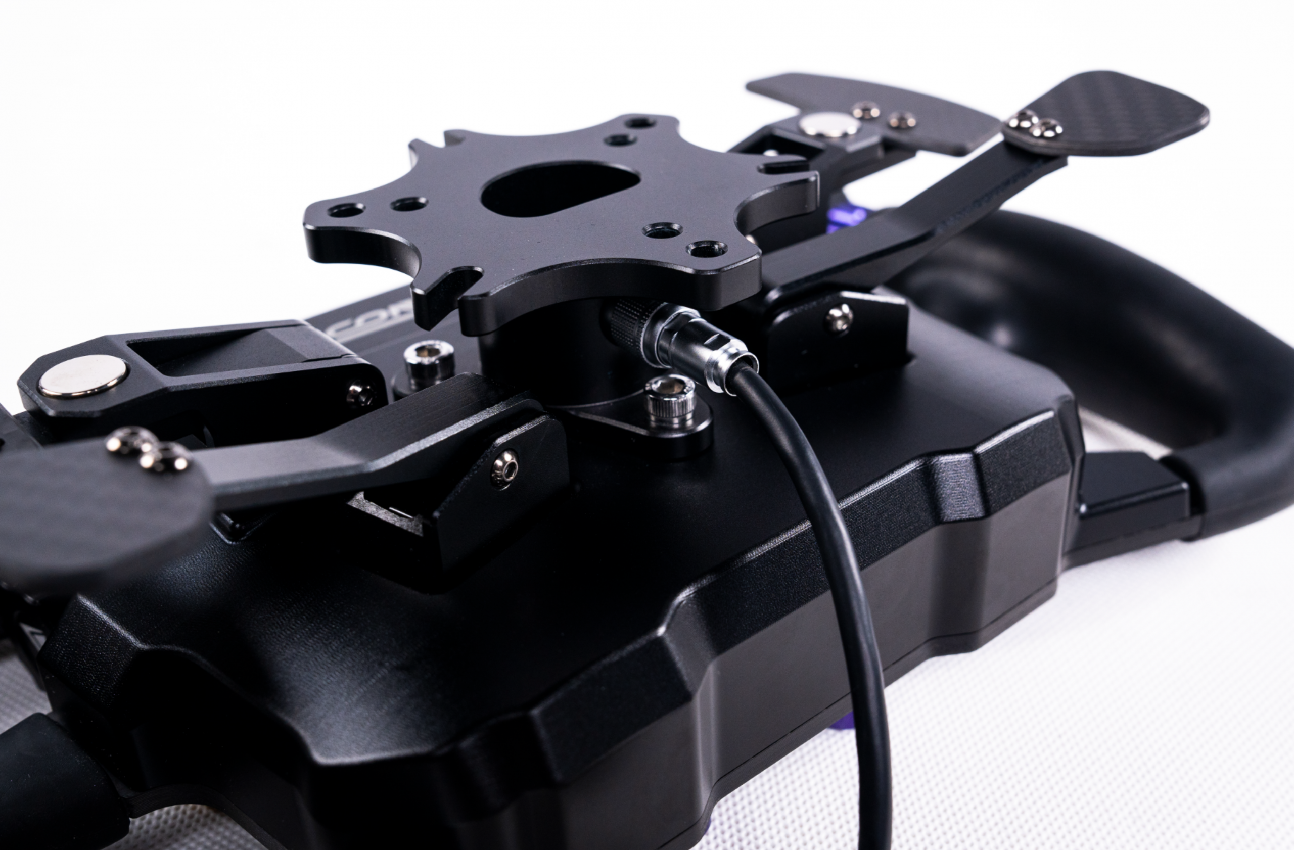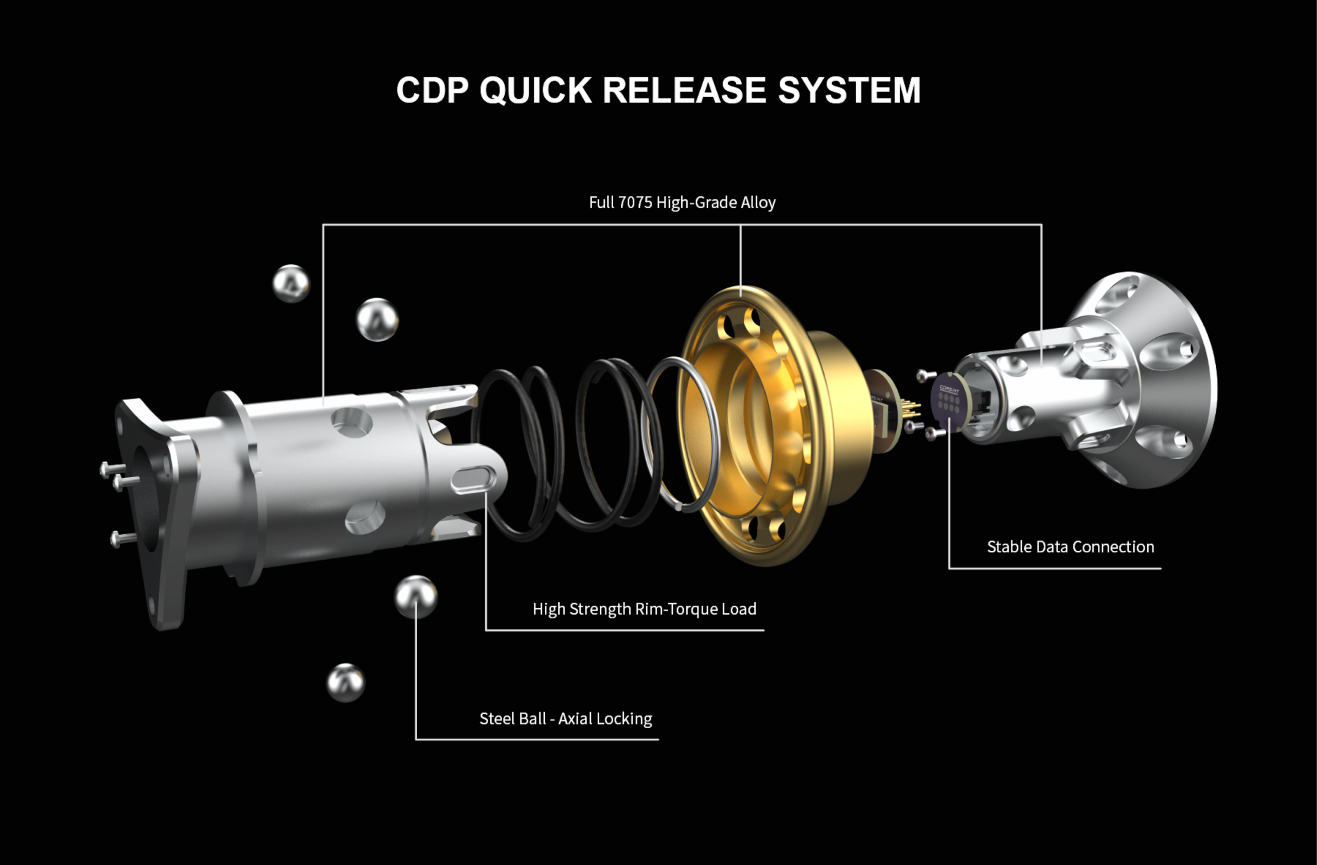 The MAX 01 is optionally compatible with the CDP quick release system for direct connection to CONSPIT ARES wheelbase. It features a Formula-inspired CNC-machined 7075 aluminum clasp and ball locking design, with the clasp handling torque transmission and the balls ensuring precise longitudinal positioning. Spring contacts provide EMI-resistant electrical stability, outperforming wireless systems. Optimized contact geometry reduces ball wear, ensuring zero-play durability under extreme loads.